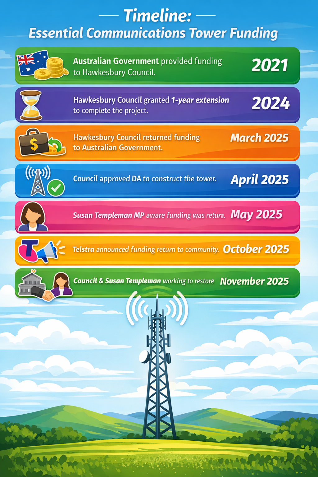 The impacted communities learnt of the bungle in October 2025 after Telstra informed them that Hawkesbury Council had returned the grant to build the tower.