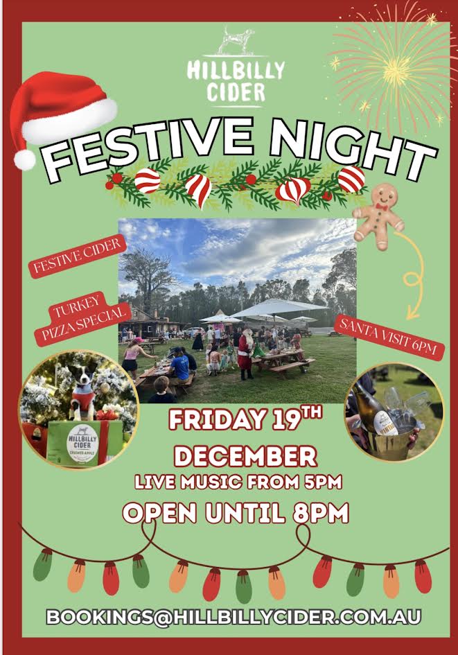 Hillbilly Cider is hosting its annual Festive Night on Friday, December 19, with the cider shed open until 8pm for an evening of Christmas cheer. The event will feature live music from 5pm, a special Christmas pizza, and a visit from Santa at 6pm, making it a family-friendly way to welcome the holiday season.