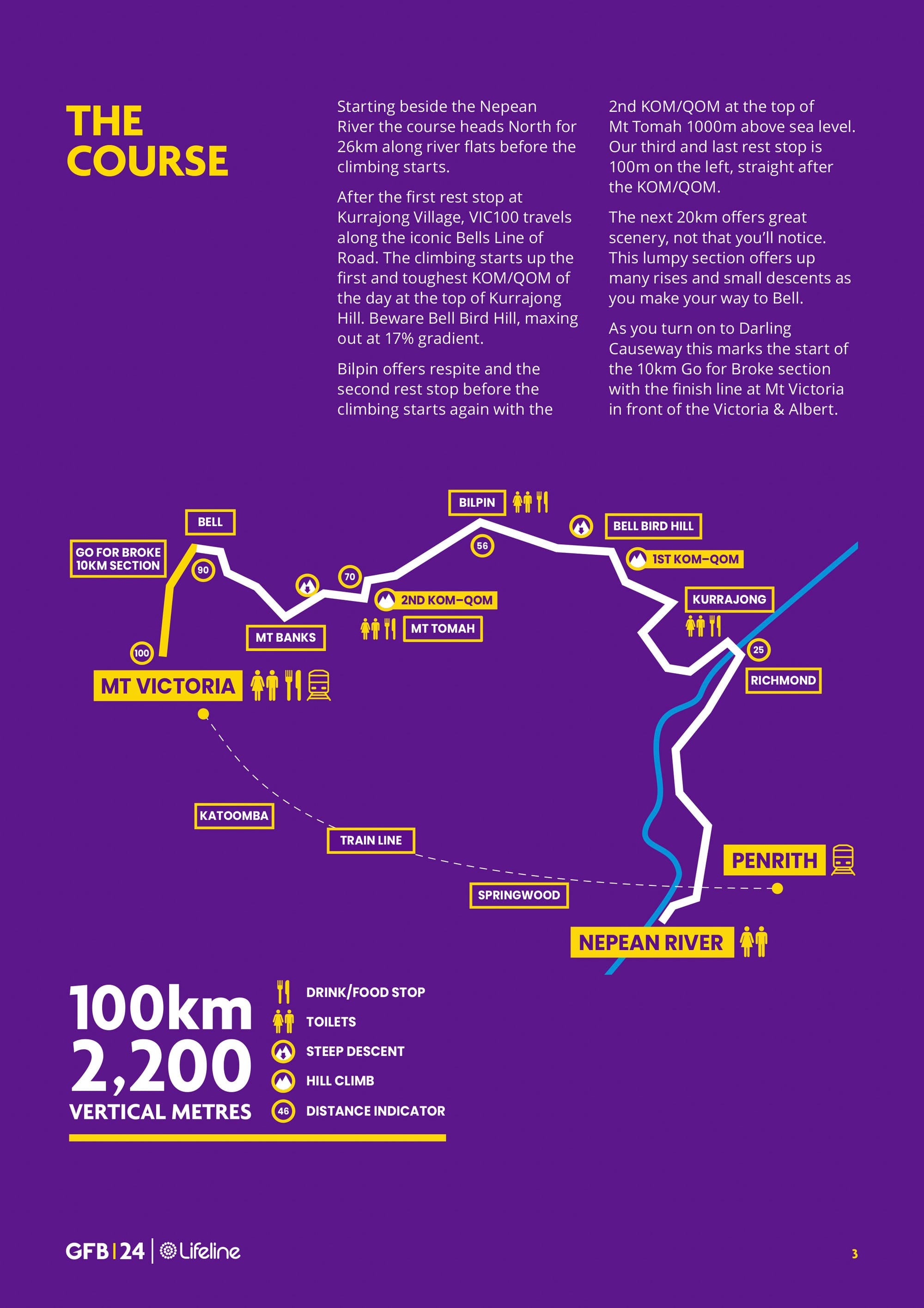 The event, which begins with groups of riders commencing between 5.30am and 7.30am at Tench Avenue, Penrith, raises funds for Lifeline mental health services located in Gordon, Campbelltown, and Bathurst. Riders will pass through the Hawkesbury en route to the Blue Mountains, finishing at Mount Victoria.