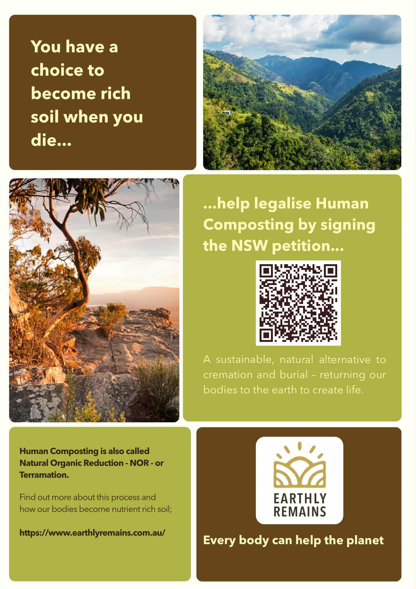 A live petition before the NSW Parliament is calling for residents to be given the choice of human composting — a sustainable and community-led alternative to burial and cremation.